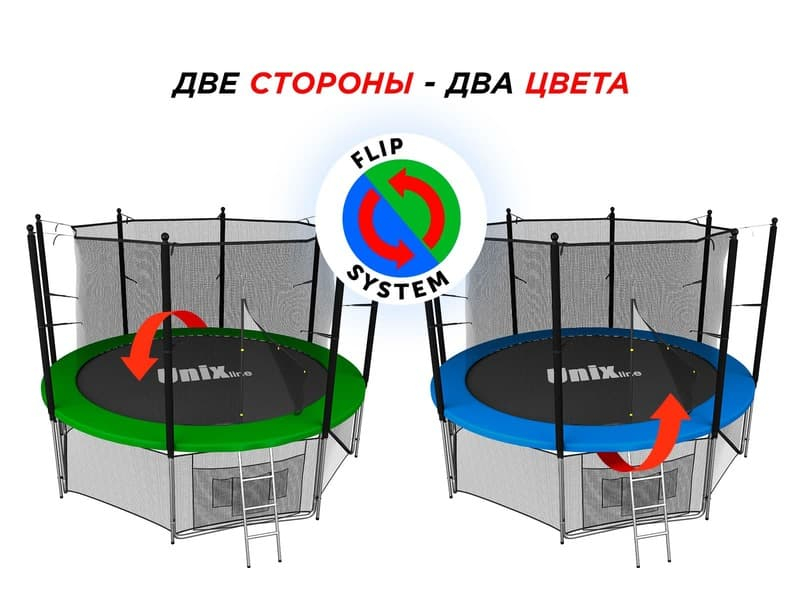 Помимо верхней защитной сетки, все батуты модельного ряда UNIX line оборудованы нижней защитной сеткой, которая препятствует проникновению под прыжковое полотно батута детей, животных, а так же попаданию посторонних предметов, и лестницей для удобства пользования. А в моделях диаметром от 10FT (305см.), в комплект входят специальные крепления батута к земле (колышки).